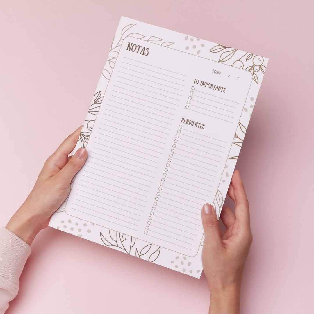 Descubre un conjunto práctico de cuaderno de notas en alta calidad, en tamaño A4, que incluye una elegante tapa y un modelo de página interna diseñado para que imprimas la cantidad que necesites. Este set te permite elegir de una vez por todas el lugar donde tomar tus notas, trabajar o plasmar cualquiera de tus ideas.